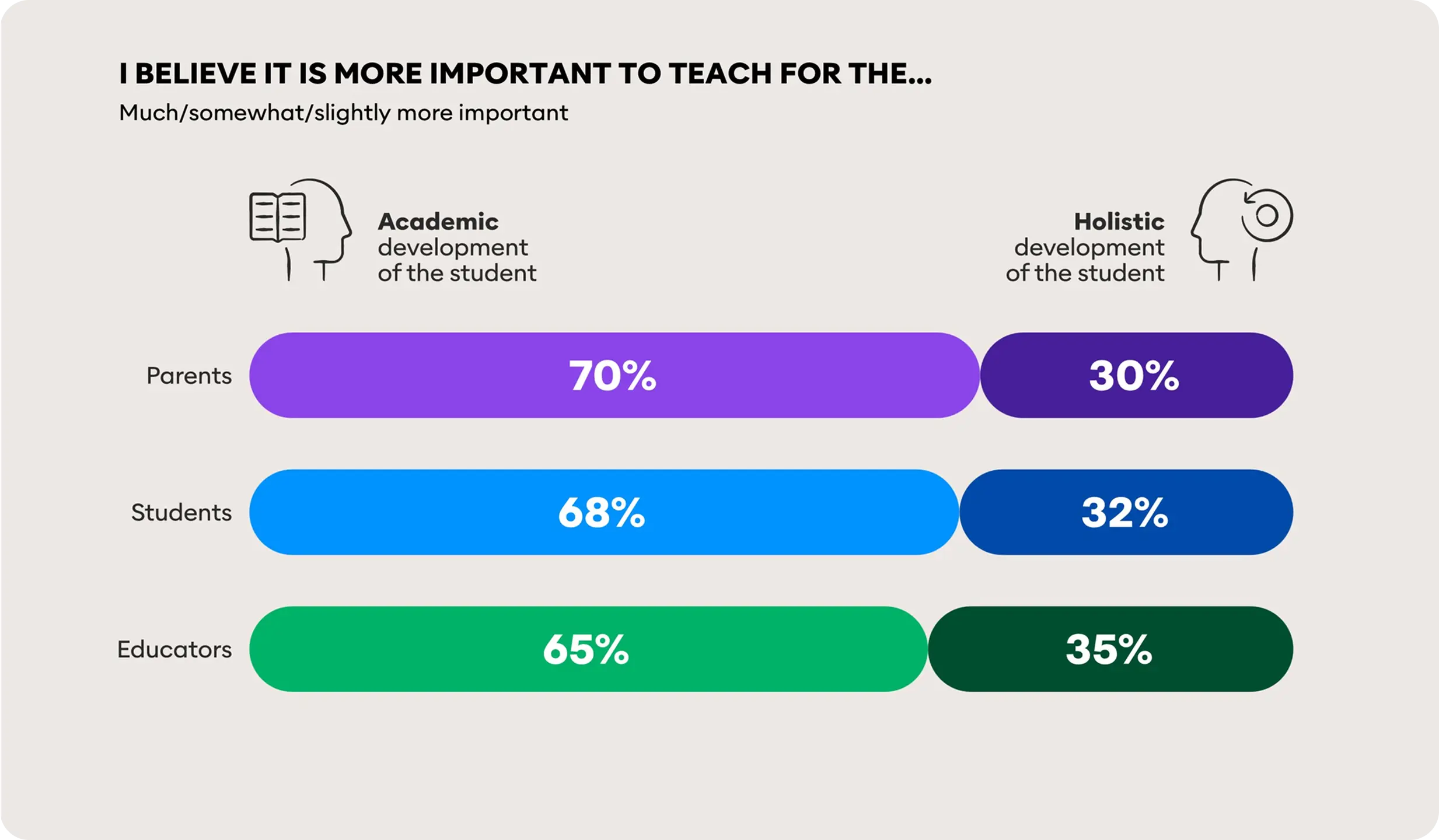 The majority of parents (70%) , students (68%) and educators (65%) believe it is more important to teach for the academic development of the student, compared to around 30% who believe it is more important to focus on the holistic development of the student.