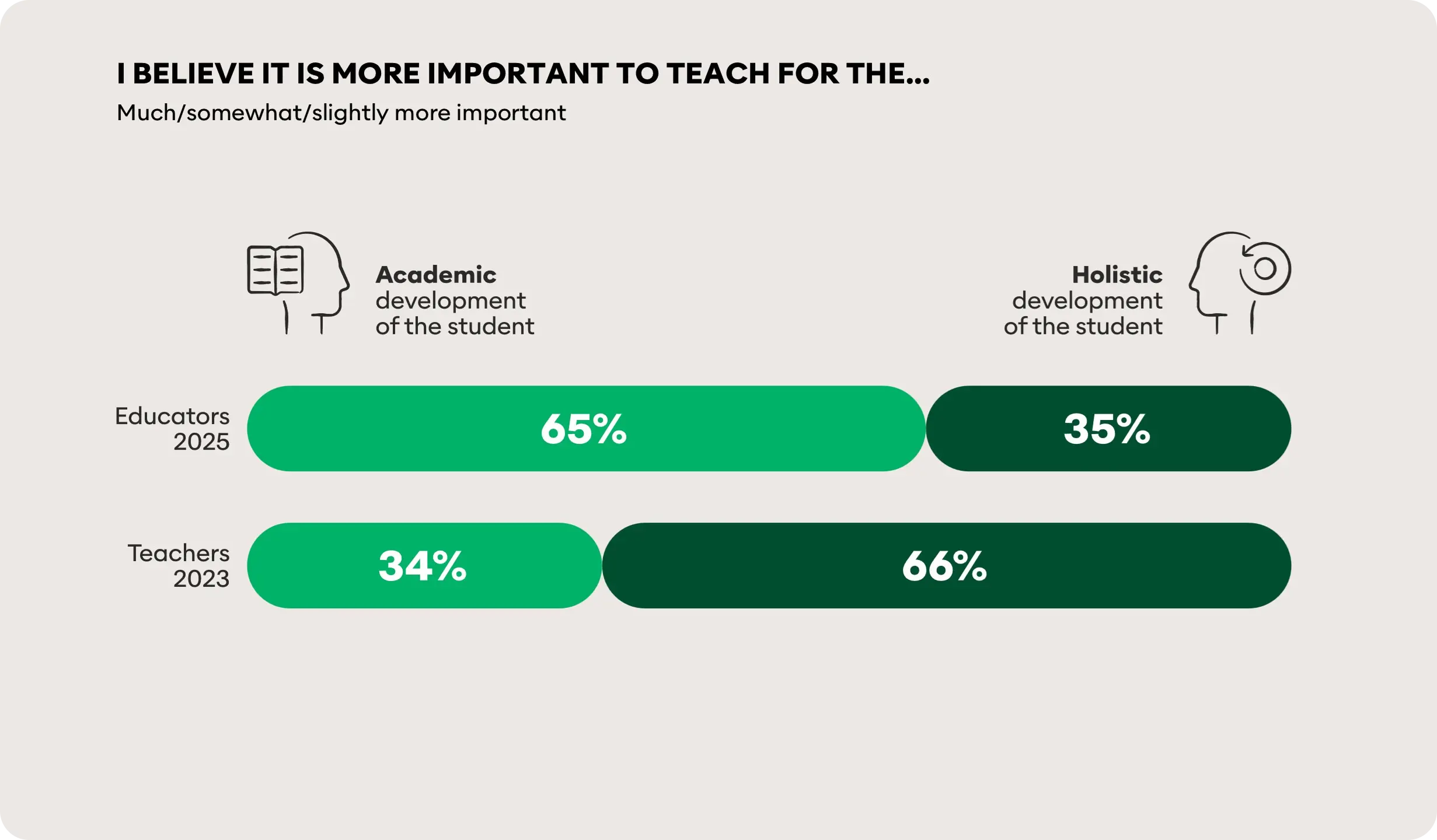 This is a shift from 2023 when just 34% of teachers believed it was more important to teach for the academic development of students, and 66% prioritised the holistic development.