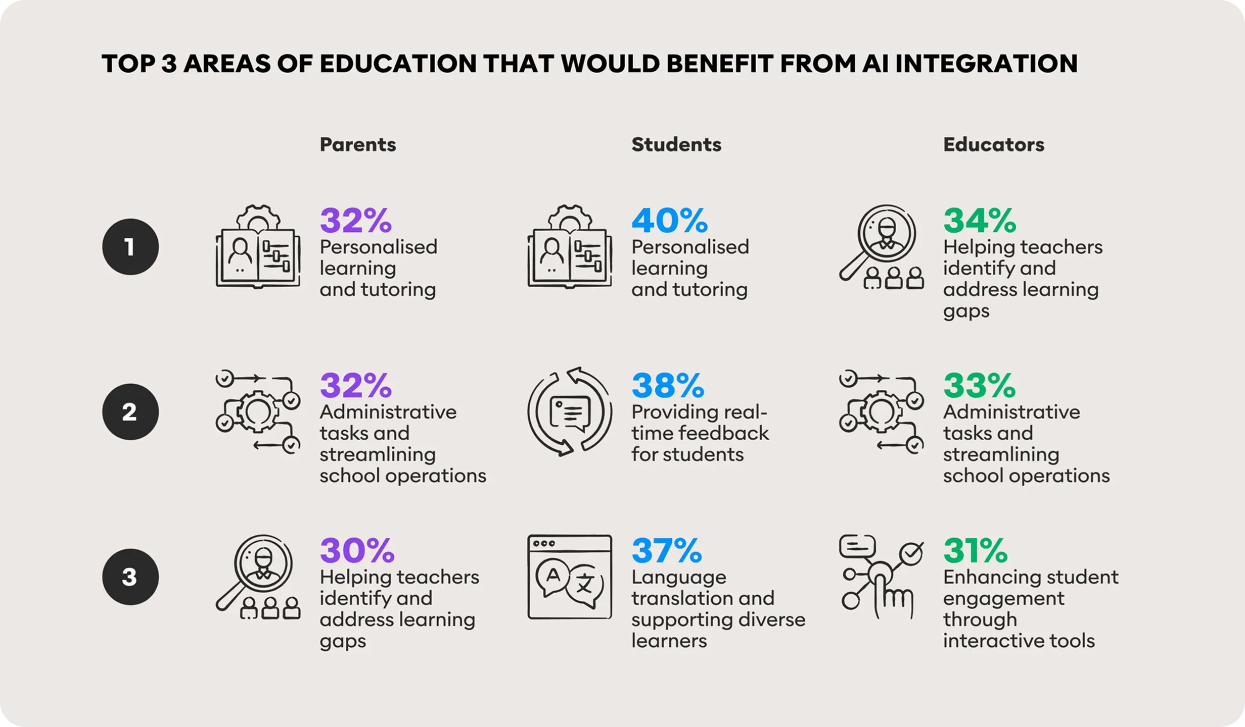There’s no doubt that AI is playing a part in the classroom. And despite the majority of parents, students and educators agreeing that there is too much focus on teaching aided by technology, parents and students shared with us that a key opportunity they see is the personalisation of the learning experience through AI. Educators also agreed that it could help identify and address learning gaps.