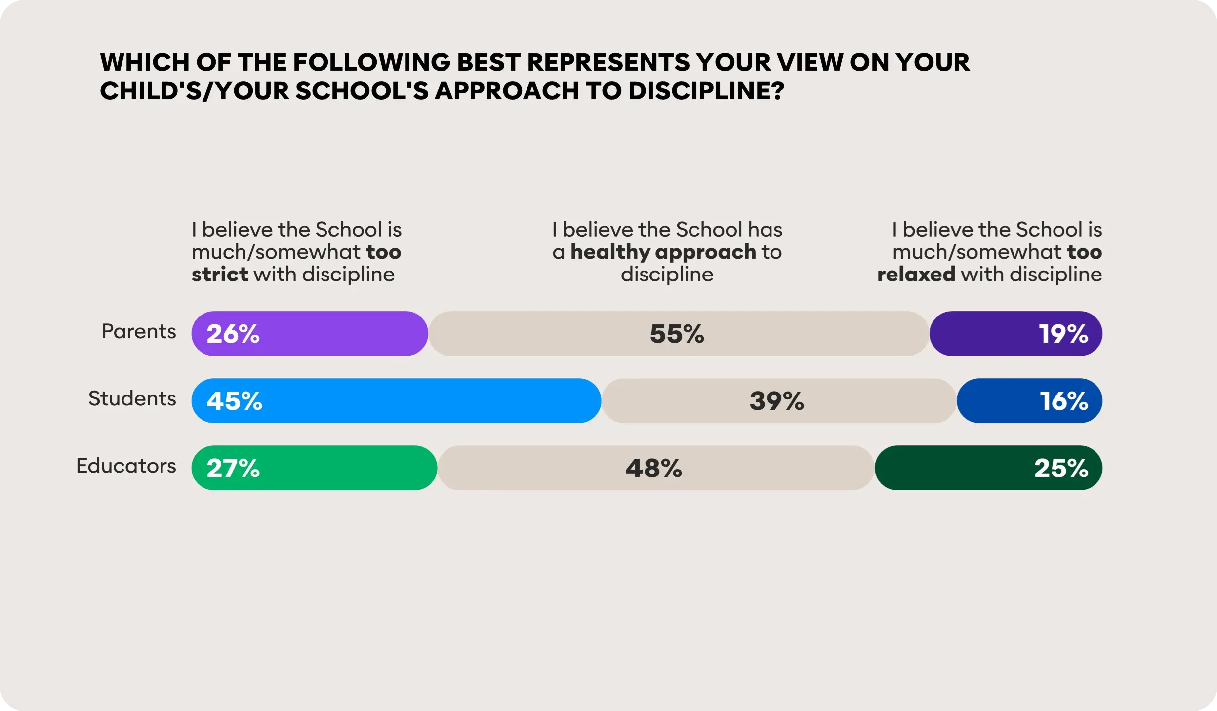 Insights from parents, students and educators suggest differing attitudes towards discipline. Around half of parents and educators believe their school has a healthy approach to discipline. Students are a little lower at 39%. Students, however, are more likely than parents and educators to believe their school is much/somewhat too strict with discipline.