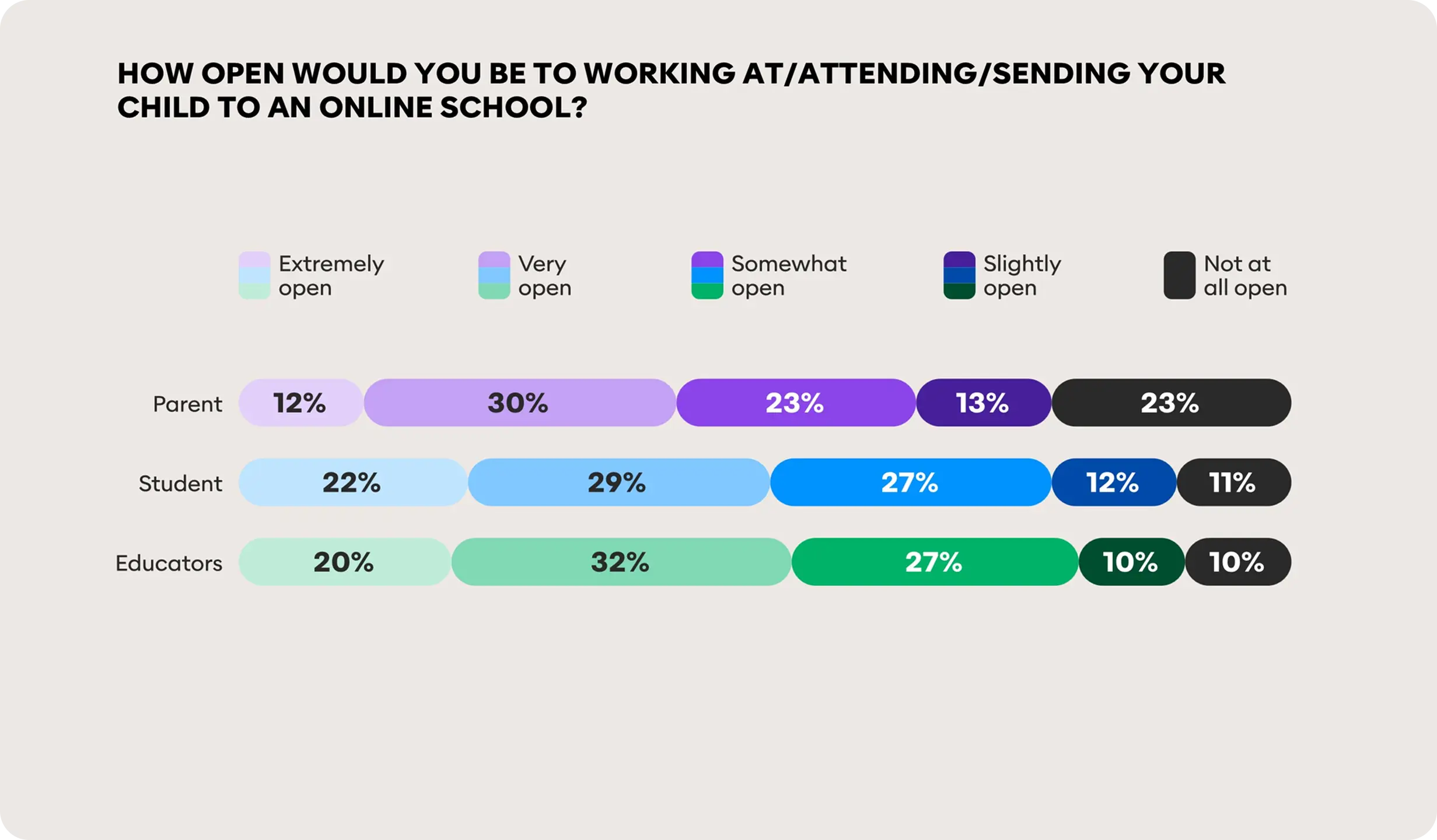 When it comes to online schooling, we found that nine in ten educators (90%) and students (89%) are open to it (extremely/very/somewhat/slightly open), compared to 77% of parents.