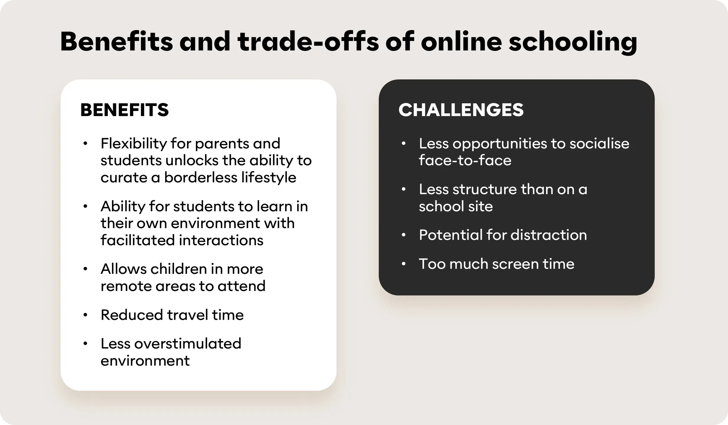 While online schooling may present benefits, there are also trade-offs to consider. Stakeholders noted benefits such as greater focus and flexibility, to challenges such as less socialisation and too much screen time.