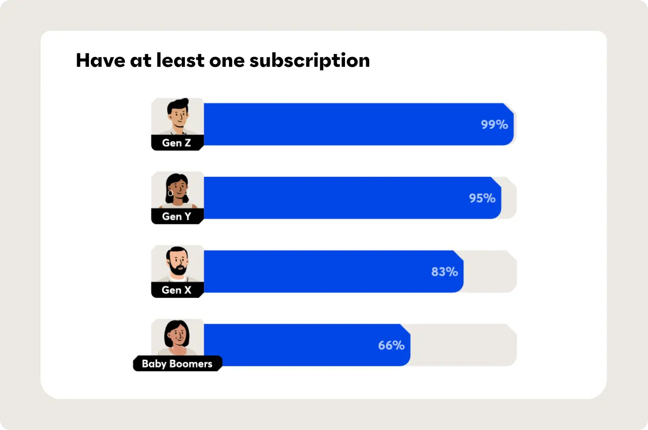 As digital natives, younger generations are the most enthusiastic adopters of subscription services. Almost half of Gen Z (48%) say they love or like subscriptions, compared to just 12% of Baby Boomers. Yet despite being less enthusiastic, older generations are still active users. More than four in five Gen X (83%) and two in three Baby Boomers (66%) hold at least one subscription. In contrast, subscriptions are near-universal among younger cohorts, with almost all of Gen Z (99%) and the vast majority of Gen Y (95%) signed up to at least one.