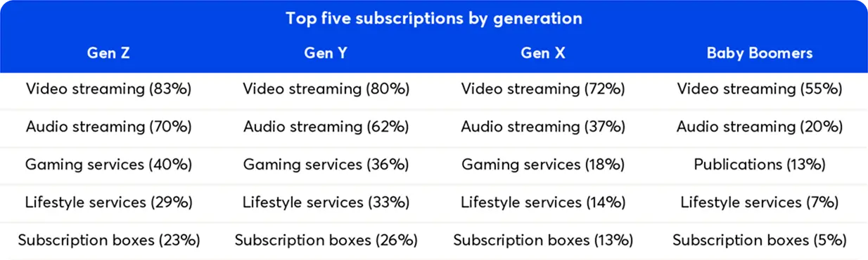 The most common subscription service to use across the generations is video streaming, followed by audio streaming. Gaming services are also common among Gen Z, Gen Y and Gen X, however publications are the next most popular service for Baby Boomers.