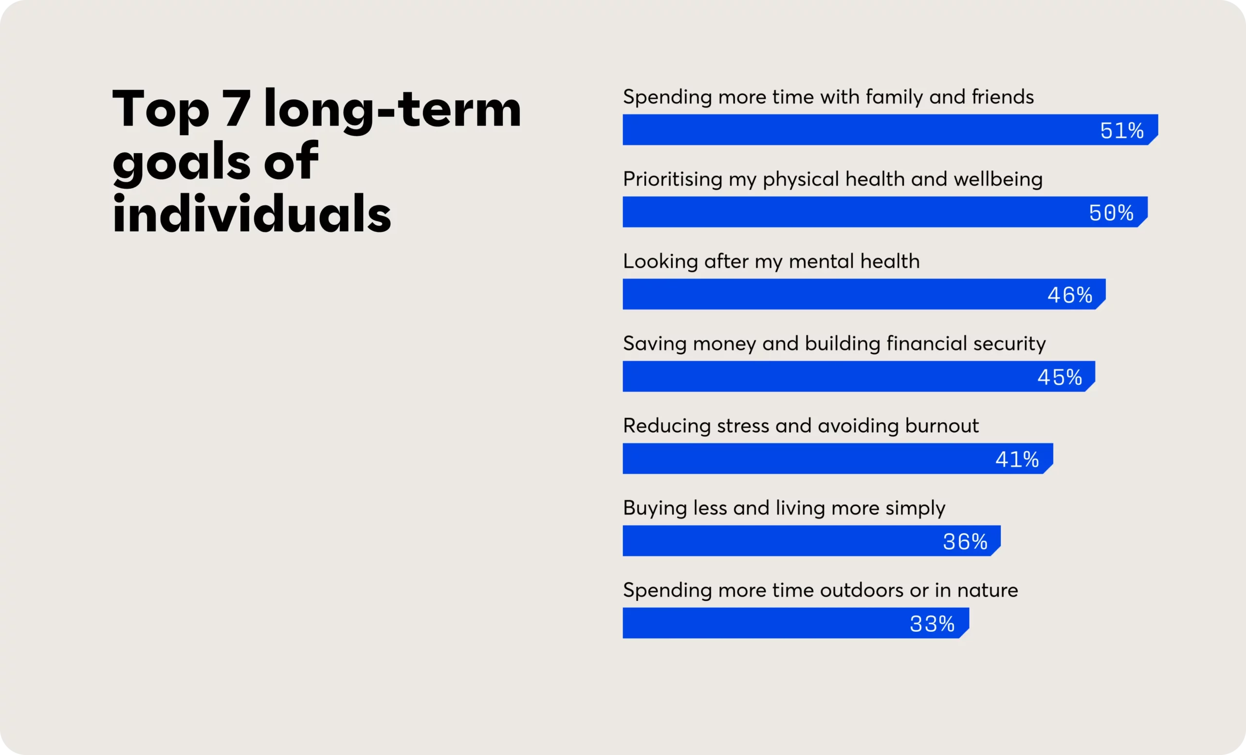 Intentional living is a purposeful shift from passive consumption to active creation. It’s a mindful rejection of “hustle culture,” where people make conscious choices about their time, energy, and resources. When it comes to the long-term goals people have there is a lift in the social, health and financial goals as well as simplicity of life and time spent outdoors.