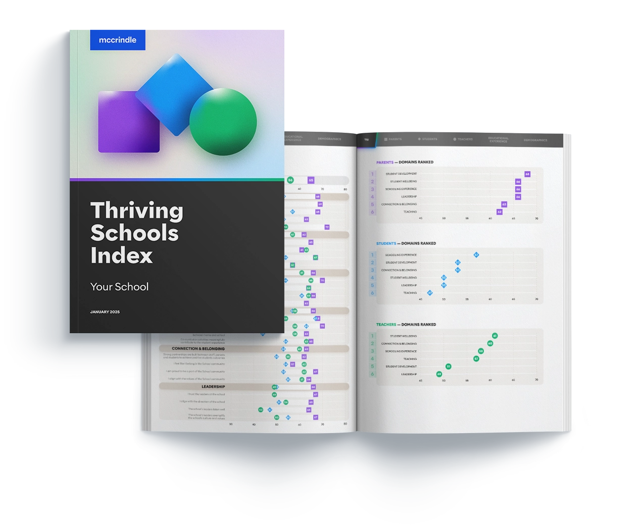 St Mark’s utilised McCrindle’s Thriving School Index, a school stakeholder study to gather data from key stakeholders including parents, staff and students and compare the results against national data. The Thriving Schools Index includes 24 questions across 6 domains: